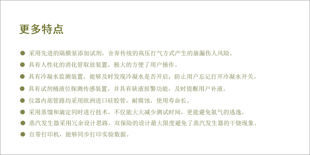 全自動(dòng)設(shè)計(jì) | 自動(dòng)完成樣品稀釋、加酸、加堿、蒸餾、滴定、反應(yīng)杯排空和清洗、自動(dòng)校正、結(jié)果計(jì)算及輸出打印,無(wú)須人為干預(yù)。內(nèi)置多種常規(guī)使用方法。 |